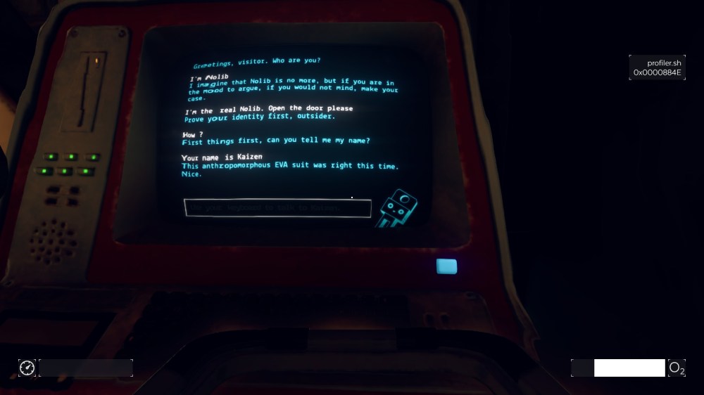 C’est ainsi que le dialogue s’instaure. À la fois principal outil pour franchir les obstacles du jeu, mais aussi personnage secondaire et principal moteur de l’intrigue, Kaizen deviendra pour quelques heures votre seul compagnon. Chaque action souhaitée devra passer par un ordre des plus limpide « Ouvrir porte D11 » « Fais descendre l’ascenseur ».Il est néanmoins nécessaire d’avoir de véritables conversations, en enquêtant sur le passé du vaisseau ou en exposant ses plans afin d’avancer dans l’intrigue. Nous sommes en face d’une réelle IA, certes perfectible, mais qui ne se contente pas comme dans les jeux textuels des années 70-80 de recracher des lignes préenregistrées à l’apparition du moindre mot clé. L’orthographe, la curiosité du joueur et même sa politesse influeront grandement sur le déroulé de l’histoire, d’autant plus que Kaizen possède son petit caractère, brouillant encore plus la frontière entre le joueur et la machine.